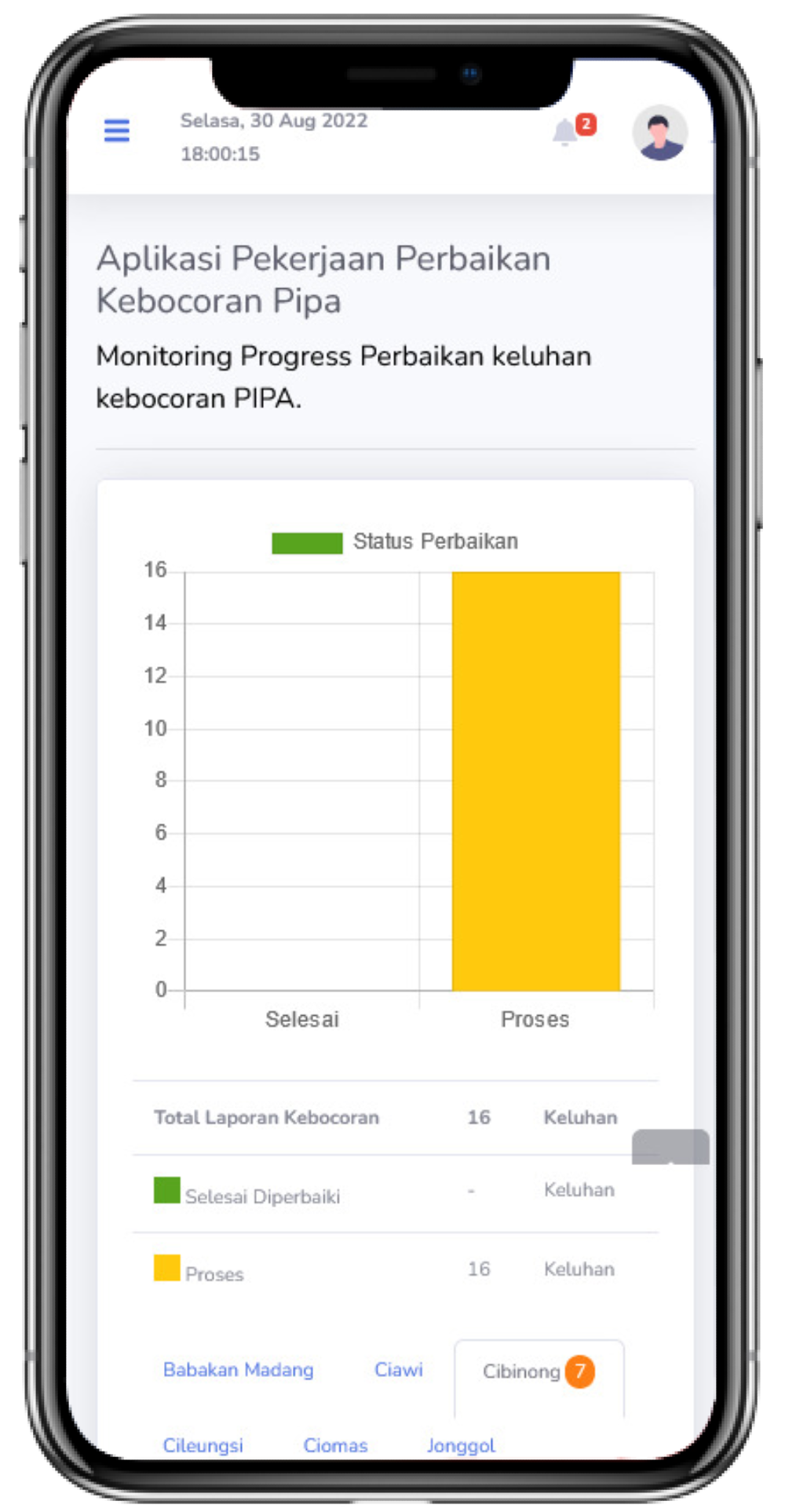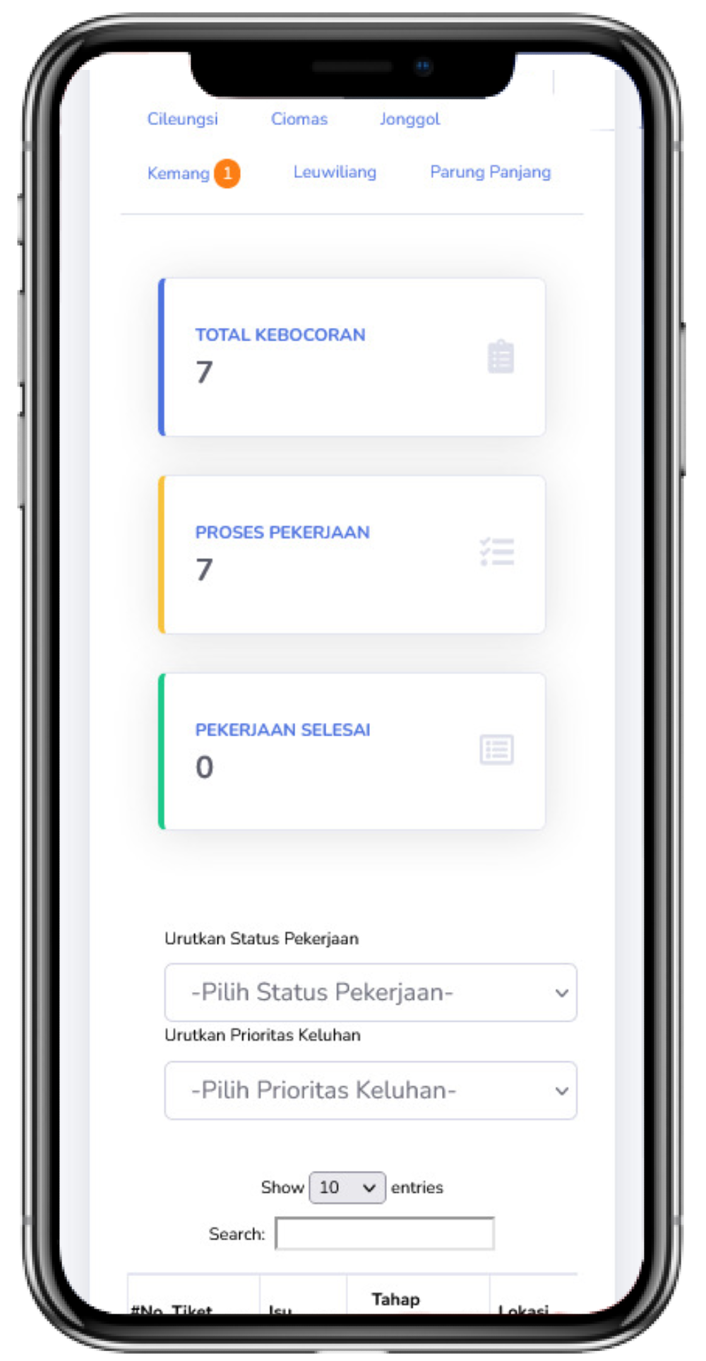 Dashboard 'Laporan Kebocoran Pipa PDAM Tirta Kahuripan'